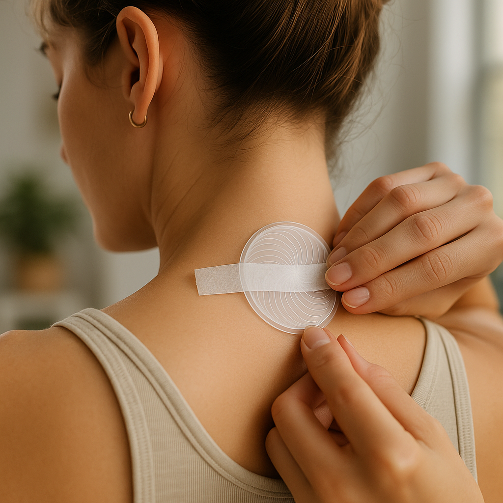 Use medical tape, toupee tape, clear adhesive film, or snug clothing/wrap to hold the disc comfortably.